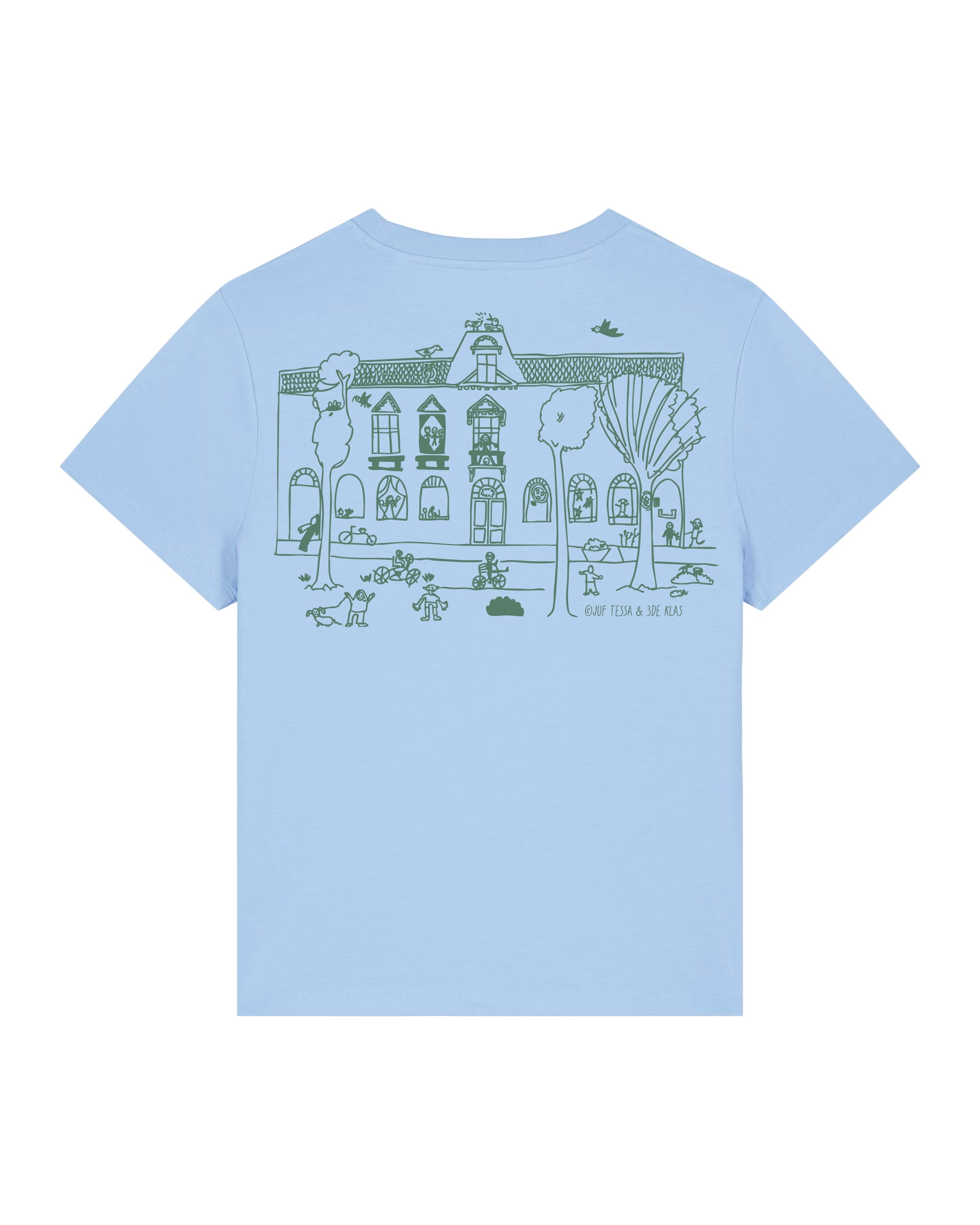 Op de achterkant staat een supercoole tekening, gemaakt door juf Tessa en de derde klas. Speciaal ontworpen voor de Kleine Wereldburger kledinglijn.