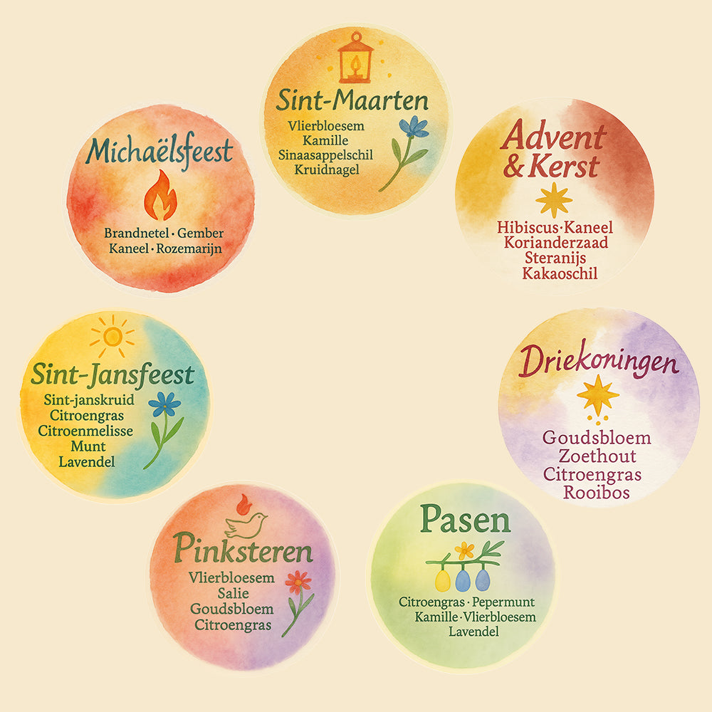 In deze bundel vind je zeven unieke kruideninfusies — elk geïnspireerd op een van de jaarfeesten van onze school.