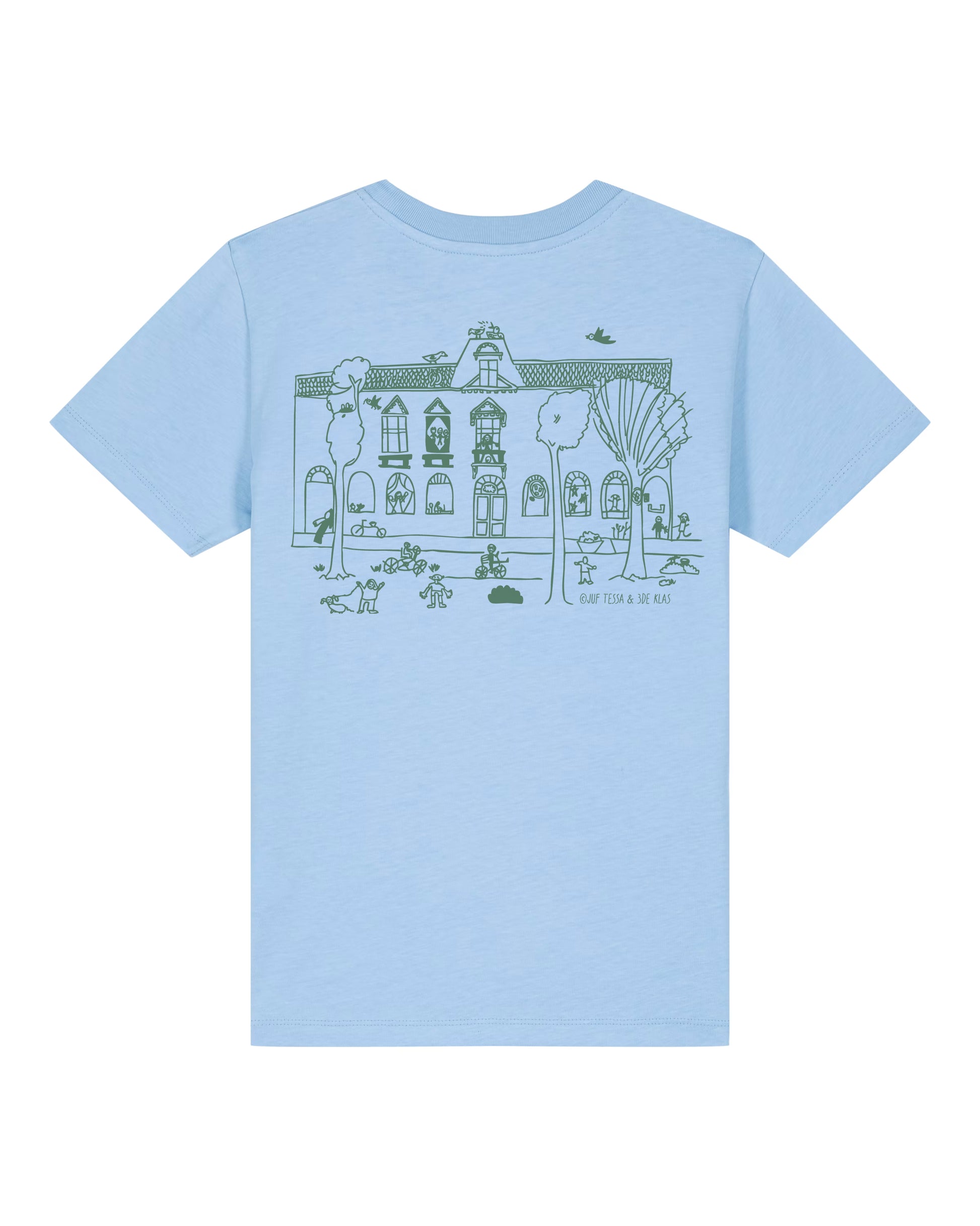 Op de achterkant staat een supercoole tekening, gemaakt door juf Tessa en de derde klas. Speciaal ontworpen voor de Kleine Wereldburger kledinglijn.